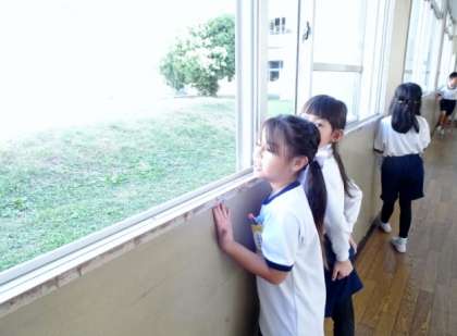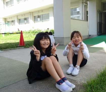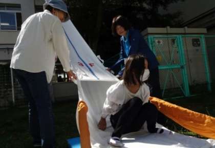 休み時間になり、救助袋の避難の様子を見る観客たちがいました。
