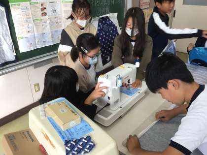 家庭科では、ミシンを使ってエプロン作りに挑戦しています。