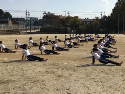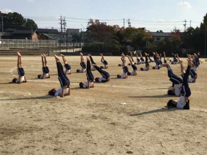 組体操の一人技の様子です。拍を自分で数えて、動きが揃っていました。