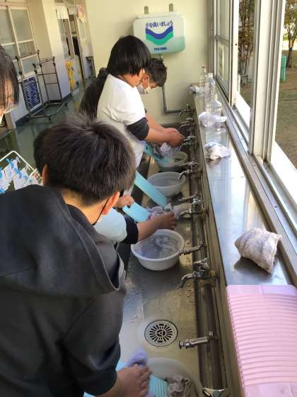 6年生が洗濯板を使って、掃除の時間に使っているぞうきんをきれいにしました。