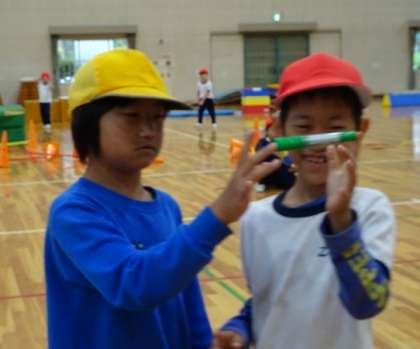 2人で間に挟んだマジックを落とさないように持ちながら、鬼ごっこに挑戦するようです。力加減が難しいかも。