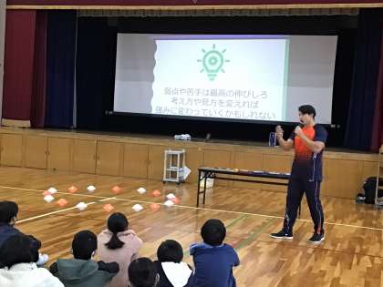 トヨタ自動車に所属している、円盤投げの選手である湯上選手に来校していただきました。