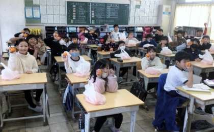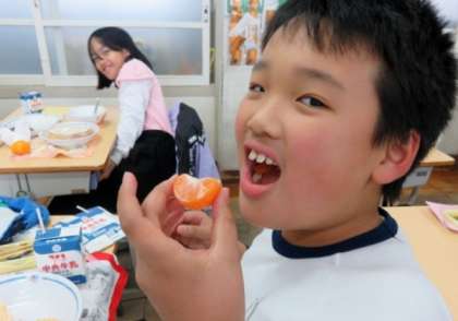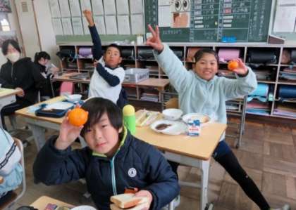 今日は特別です。給食の時間に、おいしいミカンを食べた小清水っ子もいます。