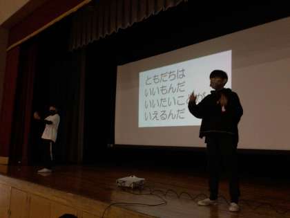 にじいろ集会の最後は、今月の歌「友達はいいものだ」を歌いました。