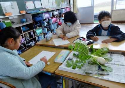 早速、とれたての大根を観察していました。