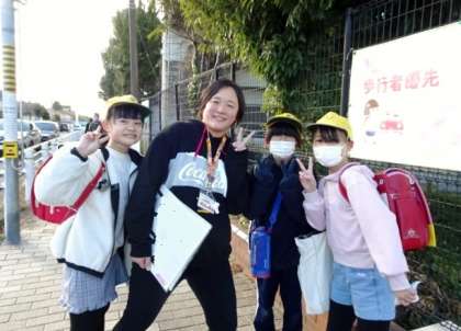 銀の門前の横断歩道を渡って帰る通学団の最後の子たちです。よい笑顔で帰っていきました。