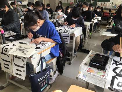 今年は「三河の城」という文字を書いています。子どもたちは、お手本をよく見て、ものすごい集中力で書いていました。書いた作品は、1月17日(水)から行われる小清水フェスティバルにて掲示されます。ぜひご覧ください。