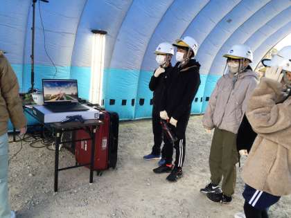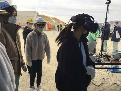 話を聞いた後は、クラス全体を3グループに分け、VR体験、高所作業車体験、ボルトの締め付け体験を行いました。写真は、VR体験の様子です。