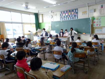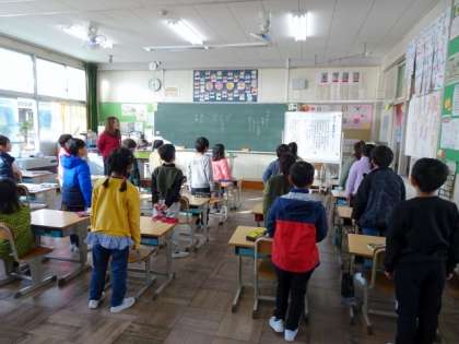 体育館から戻ってきたところ、ちょうど1年生が朝の会中でした。