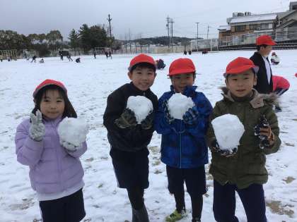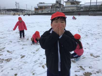 冷たくなった手に「はあっ」っと息を吹きかけている姿もかわいいです。果敢に雪の上でスライングをする子も。このあと、幾つも雪だるまが並ぶことになりました。