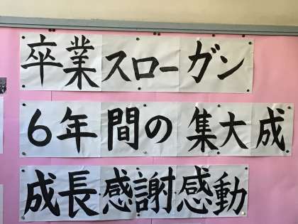 掲示板には、一年間の学びの足跡が掲示されていたのですが、今回、今までのものに加えて卒業関係の掲示物が掲示されました。卒業スローガンは、書き初め大会金賞の子たちが書きました。