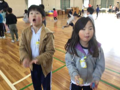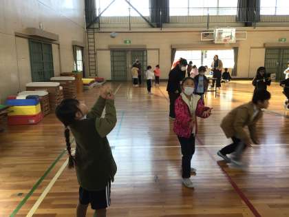 お手玉のグループでは、お手玉を追いかけてだんだん前に動いてしまう子どもたちの様子もかわいかったです