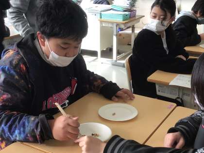 6年生が家庭科の時間に、まめつかみに挑戦していました。