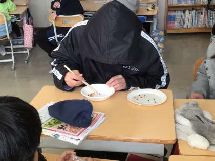 大豆や小豆を30秒間でいくつお皿から移せるかという取組です。