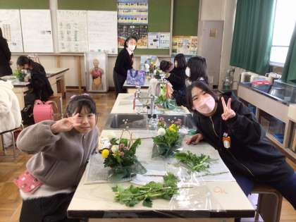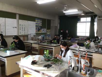 2月なので、節分の鬼と春らしい感じの菜の花を使った花を生けていました。