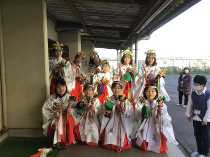 体育館の外では、出番を待つ巫女舞クラブの子たちがいました。ちょっと緊張しているそうですが、衣装もとてもよく似合っていました。