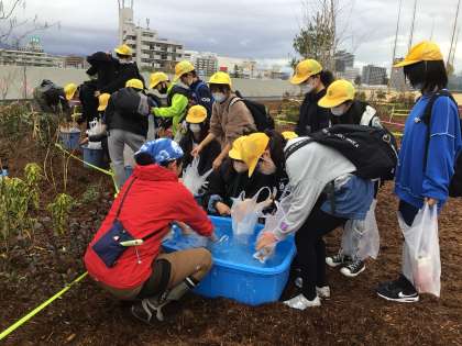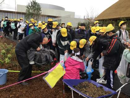豊田市博物館に到着すると、まずはどんぐりの苗を水につけました。
