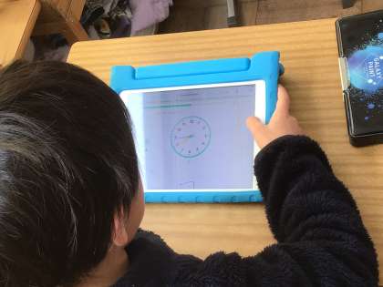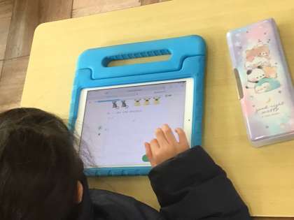 1年生の教室では、学習用タブレットを使って静かに集中しているところが見られました。
