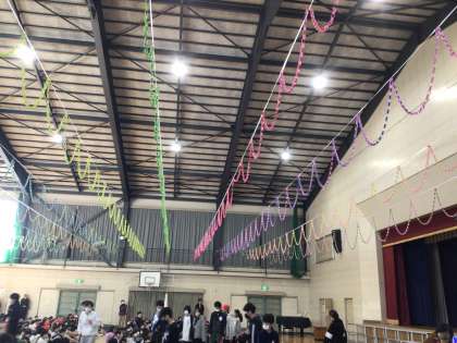 舞台から降りると、1〜5年生が心を込めて作ってくれた輪飾りが目にとまりました。