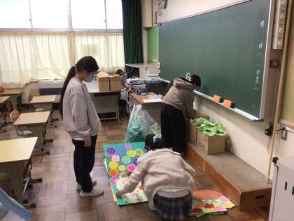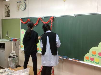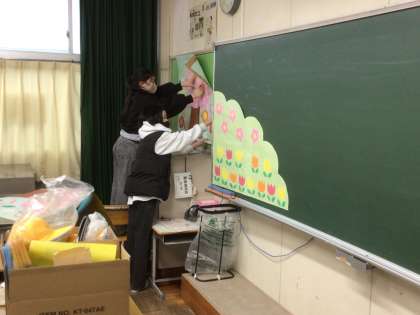 新1年生の教室の準備です。歓迎の飾り付けなどとても一生懸命丁寧に作業を進めます。出来上がった教室は、明日のお楽しみに!