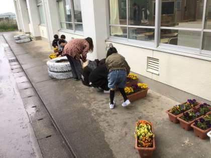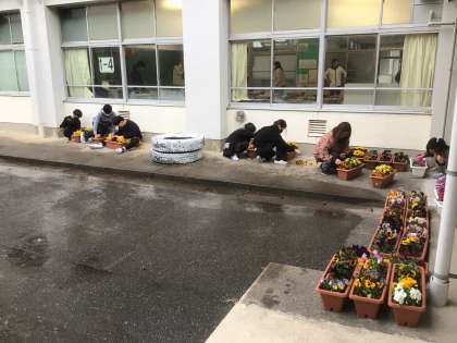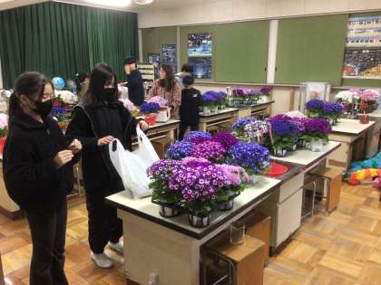 入学式には、お花が飾られます。お花の準備も新6年生がやっています。素敵な会場になります。