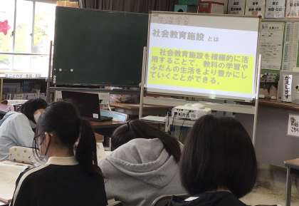 4月17日(水)の図書館の開館を前に6年生の図書館利用指導を学級ごとに行いました。図書館利用のマナーに加え、国語の学習と関連させて社会教育施設について話を聞きました。社会教育施設には、公立の図書館をはじめ、博物館や科学館など様々な施設があることを知りました。これまでに利用したことのある施設も多く、関心をもって社会教育施設の働きを考えていました。市内にある様々な社会教育施設を有効に活用して教科の学習や普段の生活をよりよいものにしていけるといいです。