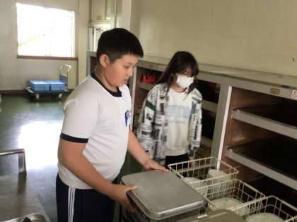 ランチタイム委員会は配膳室へ運ばれてきた食缶やごみの仕分け作業、ボランティア委員会はアルミ缶、新聞紙、牛乳パックをリサイクルとして回収する呼びかけを行っていました。新しく決まった役割にやる気いっぱいです。