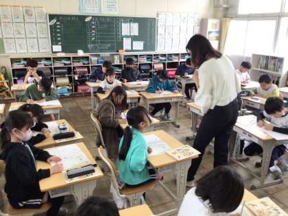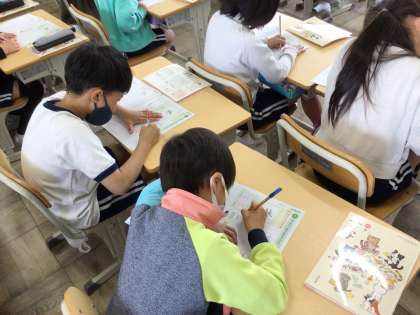 書写の授業で実際に練習する文字を書く前に、記号や線を書くウォーミングアップを行いました。習った鉛筆の持ち方を意識しながら、丁寧に書き進めることができました。