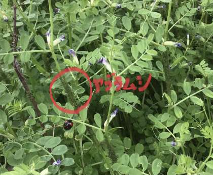てんとう虫のすぐ近くに、緑色のかたまりが見えますか?