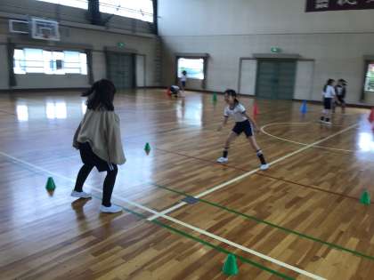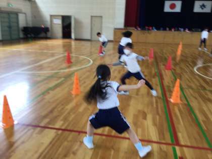 5月に行われる体力テストに向けて、ポイントとなる動きの練習をしています。今回は「反復横跳び」の練習でコーンタッチゲームを行いました。1対1の対戦型ゲームですが、フェイントを織り交ぜながら一生懸命取り組んでいました。反復横跳びの練習なので、サイドステップのレベルアップを計りましたが、夢中になりすぎてコーンにダイブしている子もたくさんいました。