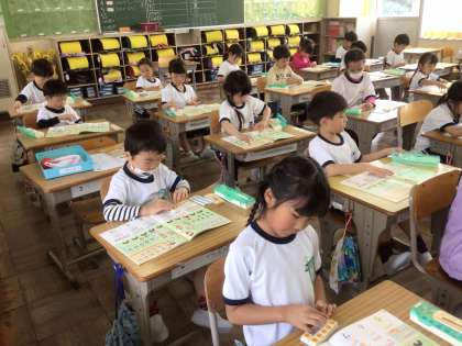 数図ブロックやプリントを使って、数の勉強をしていました。