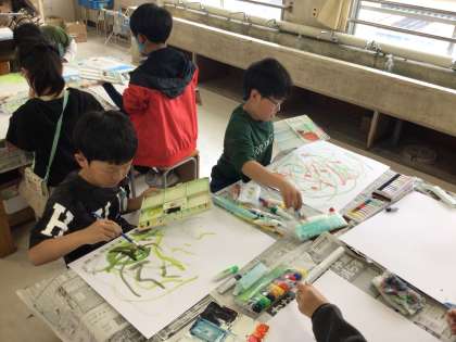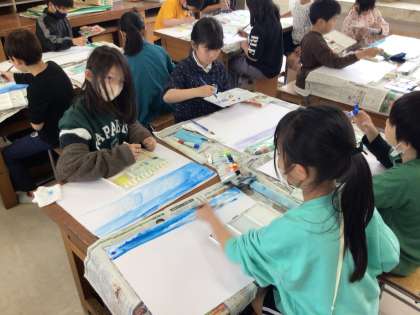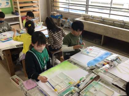 図工では、「絵の具で夢模様」と題し、自分のイメージを模様に表そうと頑張っています。今回は色々な模様をつける前の背景の色付けをしました。前回行ったグラデーションの技術を使い、個性あふれる背景が出来上がりました。作品の完成が楽しみです。