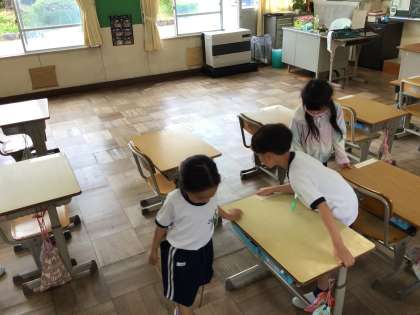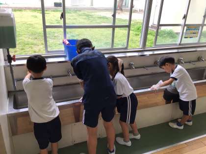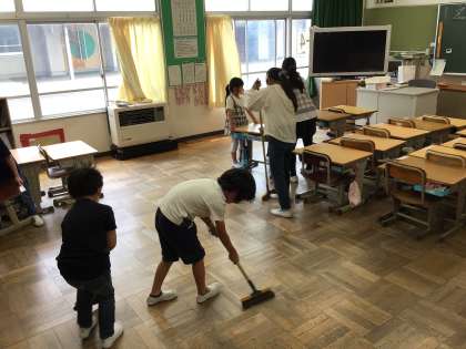 6年生に教えてもらいながら、掃除も上手になってきました。「だまって、すみずみまで、時間いっぱい」のめあてを守って掃除ができるようにがんばっています。