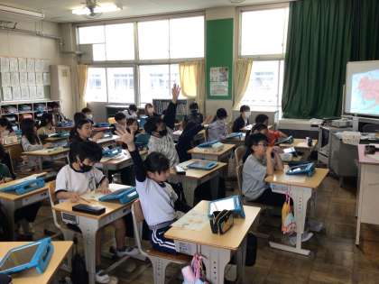 社会で、愛知の交通について考える授業を行いました。道路の話題になると、自分の知っている道を一生懸命伝えようと必死に発言していました。身近な国道について地図で思い出したり、舗装されていない道は国道ではないのかなと考えたりする姿が見られました。