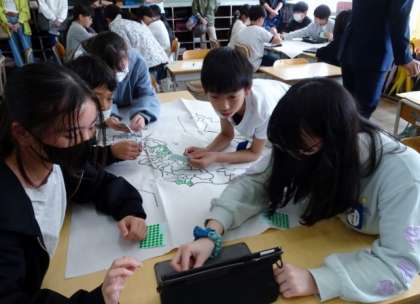 地図上に落としたら、自分の学習用タブレットで撮影し、自分専用のプリントを作るようです。資料は大きく作り、まとめ用には写真で適当な大きさに加工してプリントを作れるのも学習用多ブレットがあるからこそですね。