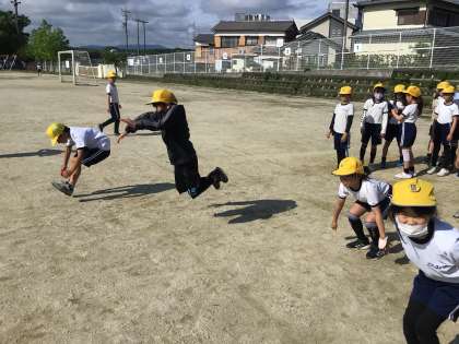 体力テストには立ち幅跳びがあります。走って勢いがつけられないので、腕を振って勢いをつける必要があります。しかし、腕振りもリズムに合わせなければ逆効果。みんなで「いち、にの、さん、はい!」とリズムを合わせてジャンプする練習をしました。