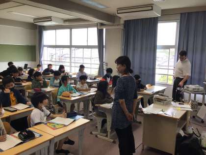 英語の時間はまだ2時間目です。前回盛り上がって終わらなかった、カイル先生の自己紹介クイズの続きです。一番好きな食べ物は?という質問で取り上げられたピザについて、カイル先生のお父さんやお祖父さんがピザ屋さんであることを知り、驚いたり羨ましがったりする姿が見られました。