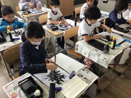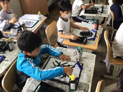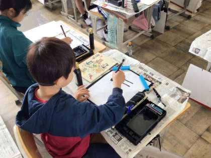 毛筆を始めて2時間目、筆の準備運動も2回目なので慣れてきてるように思います。先生の言葉を真似しながら筆を動かし、筆使いのレベルアップを目指します。