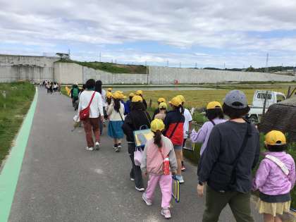 学校を出るとすぐ麦畑が目に入りました。遠くには田んぼも見えました。