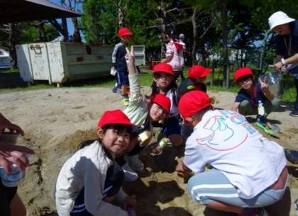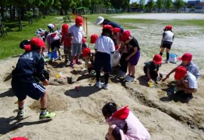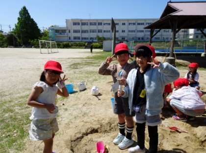 PTAの方の奉仕活動のそばで、1年生が砂場遊びをしていました。