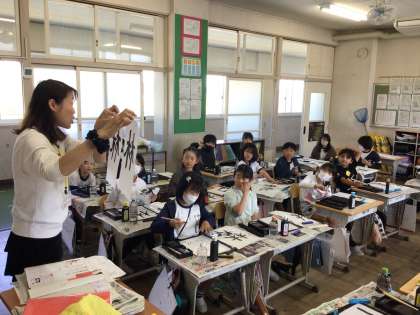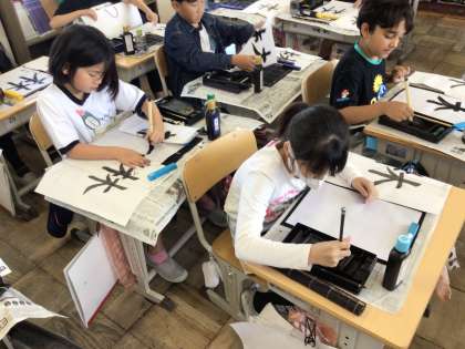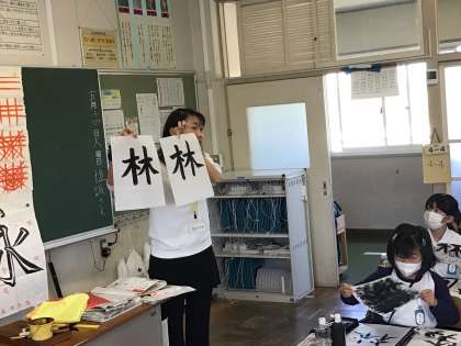 今日の書写では、「林」を清書しました。いつものウォーミングアップをしたり、友達とチェックしたりしながら、「林」のポイントを思い出しました。書いた清書の選び方を教えていただき、一番いい作品を提出しようと、真剣に選ぶ姿が見られました。