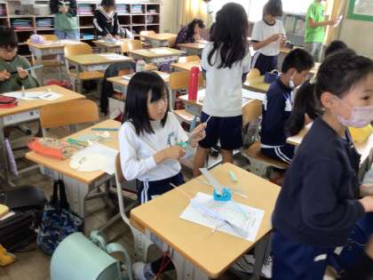 紙トンボを作って飛ばしていました。しっかり飛ぶ子もなかなか飛ばない子もいました。なぜ飛ぶのか、なぜ飛ばないのか考えるのも楽しそうです。