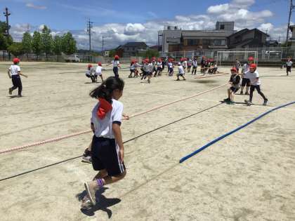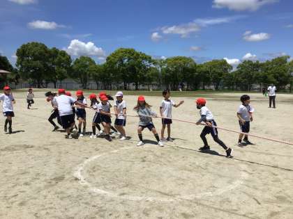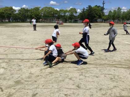 運動会で行う予定の綱取りを体験しようと学年体育を行いました。一つの綱にこだわる子、友達が引く綱に動く子、様々な動きが結果につながります。