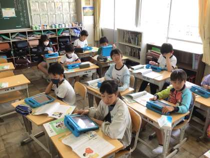タブレットの活用した授業が増えてきました。今日は道徳の振り返りが積み重なるよう、タブレットに入力しました。算数の授業や総合など、様々な授業で活用していきます。