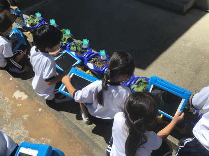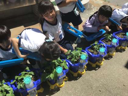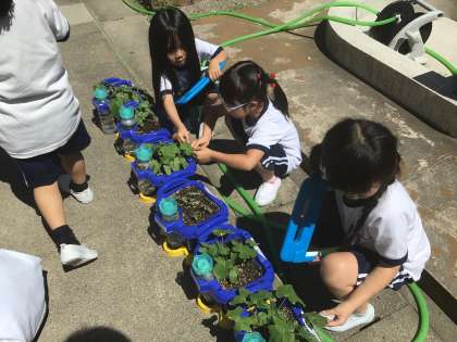 子どもたちの最近の朝の楽しみは、アサガオの水やりです。支度を終わらせると、せっせと水やりをして成長を確かめています。生活科の授業では、写真に撮って記録を残したり、絵や文章で観察したことをまとめたりしています。その中で「もっと大きくなってほしい」「きれいな花が咲いてほしい」と自分のアサガオへの願いを語り合っています。