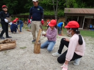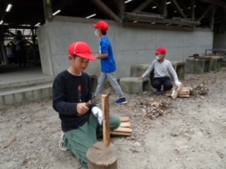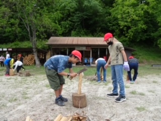 カレー作りが始まりました。 まきを割るところからです。