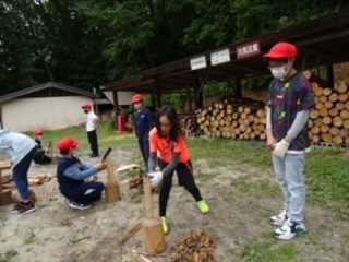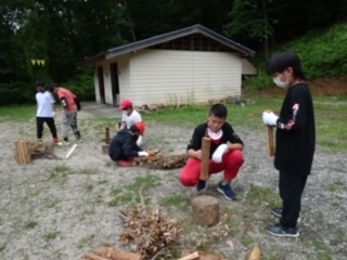 太いまきを、なたで割ります。うまくいくときもあり、節目に当たって硬いときもあり…