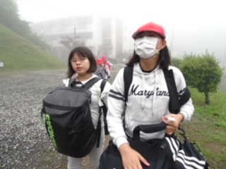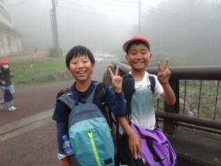 朝、深い霧がかかっていました。こんな風景が見られたのは、ラッキーかも。先をいく友達の姿も見えなくなるほどでした。そんな中、大きな荷物を持ってアリーナホールに移動しました。