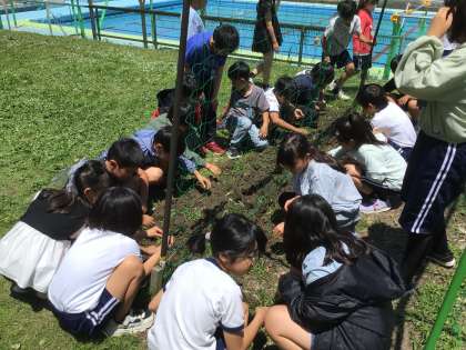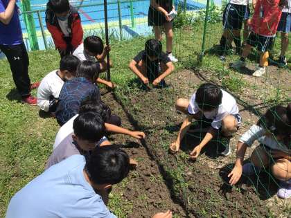 理科で育てていたツルレイシが育ってきたので、学年花壇に植え替えました。芽が出なかった子も一緒に植え替えました、まだ芽が出ていない子が「芽が出てほしいなぁ」とつぶやく姿が見られました。