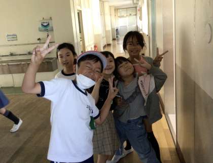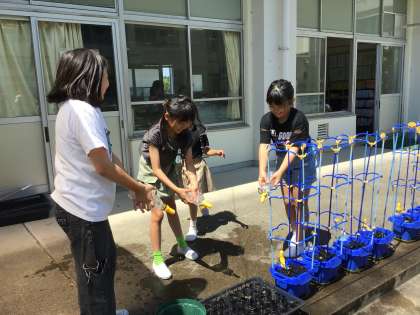 3年生が、大豆に水をあげたり、友だちとたわむれたりしていました。